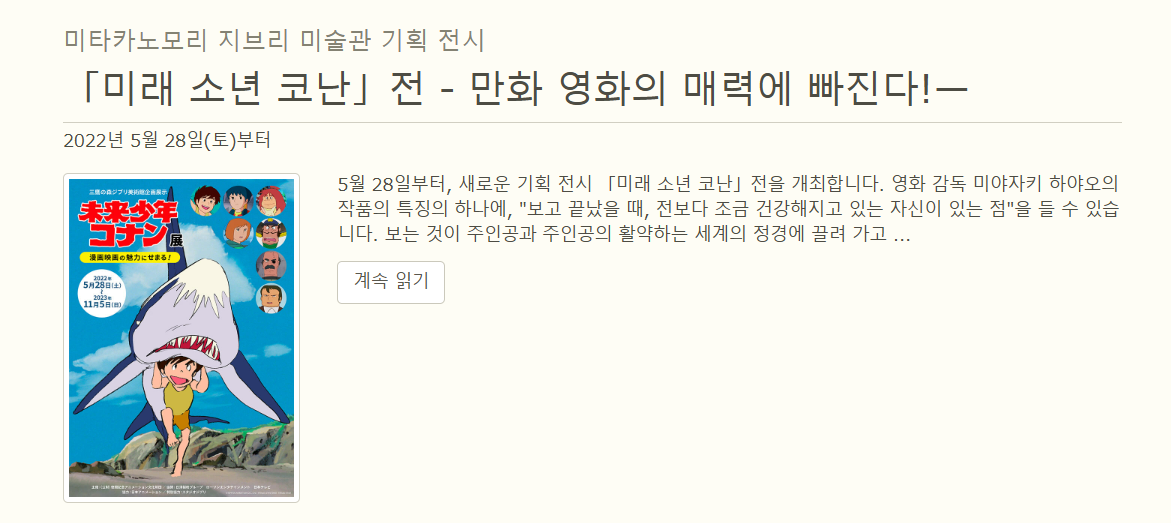 - 나우시카와 바람계곡의 전시: 미야자키 하야오 감독의 초기 작품들인 ‘바람계곡의 나우시카’와 ‘천공의 성 라퓨타’의 전시가 중심입니다.