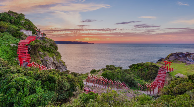 元乃隅神社(모토노스미 신사)는 일본 야마구치현 나가토시의 절벽 위에 자리한 아름다운 해안 신사입니다. 붉은 토리이(신사문) 123개가 바다를 향해 줄지어 이어지는 풍경이 매우 인상적이며, 일본에서도 손꼽히는 사진 명소로 알려져 있습니다. 특히 파란 바다와 대비되는 선명한 붉은 토리이는 사계절 내내 아름다운 경관을 자랑합니다. 소원을 적은 동전을 높이 위치한 헌금함에 던져 넣는 독특한 풍습도 이 신사만의 매력 중 하나로, 성공하면 소원이 이루어진다고 전해집니다.